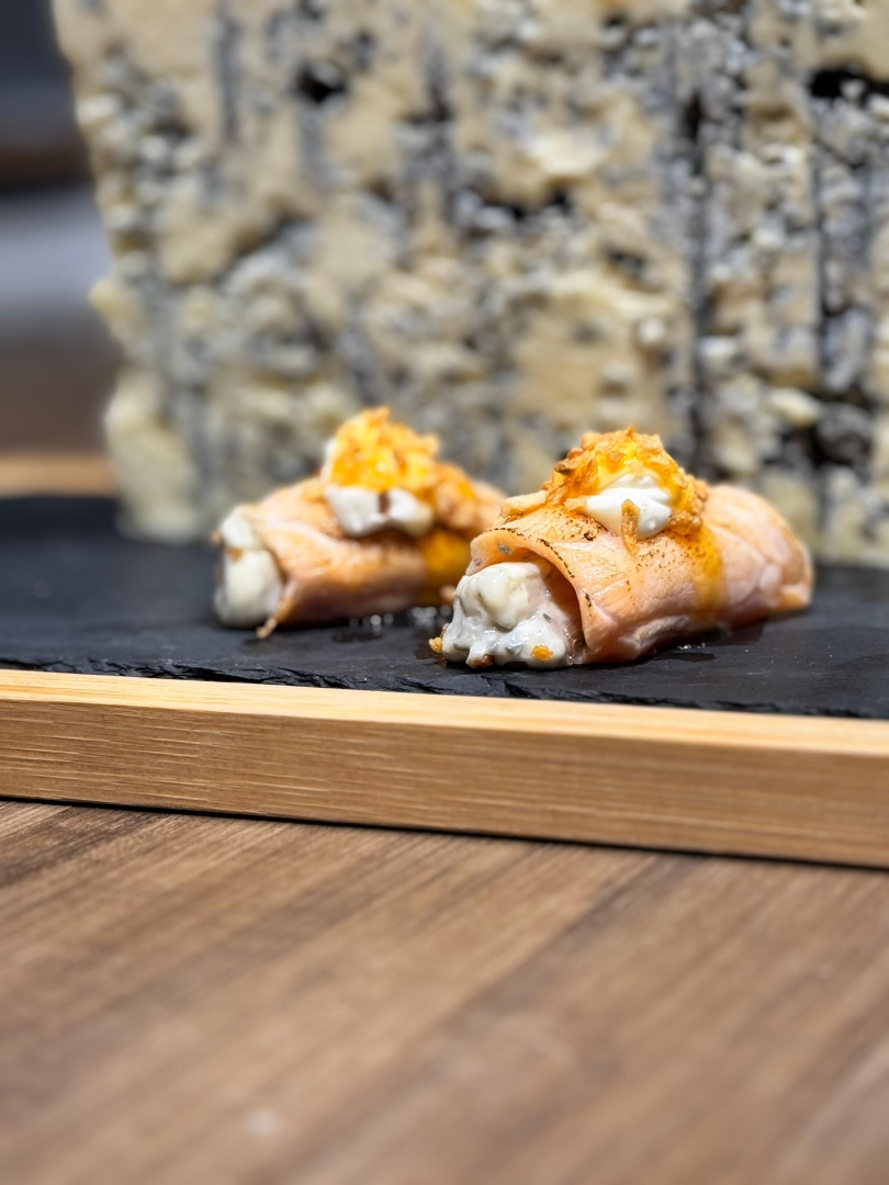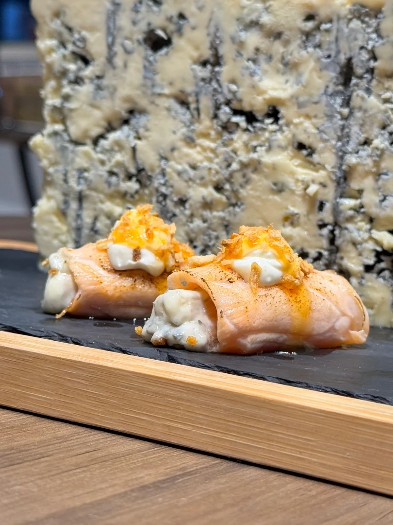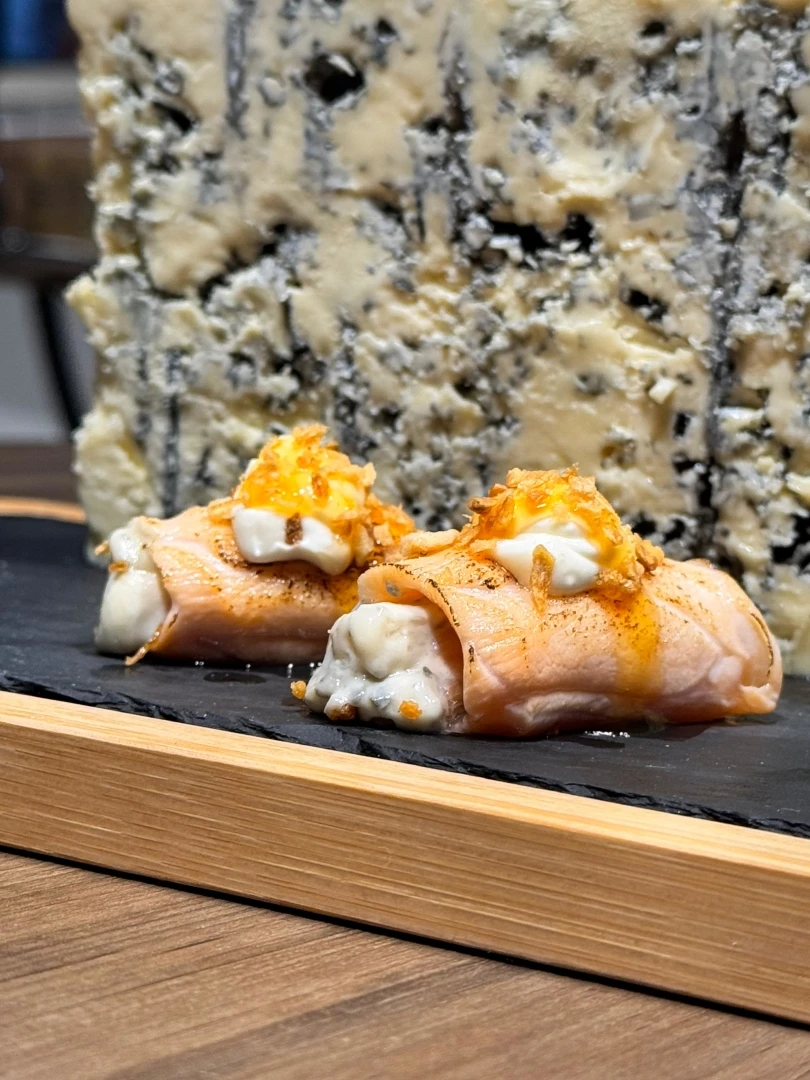 Uma combinação intensa e sofisticada. Metade salmão fresco envolto em uma cremosa pastinha de gorgonzola com cream cheese, levemente maçaricado para realçar os sabores. Finalizado com patê de alho-poró, toque adocicado de geleia de pimenta e crocante de alho desidratado, criando um equilíbrio perfeito entre cremosidade, defumado, picância e crocância.