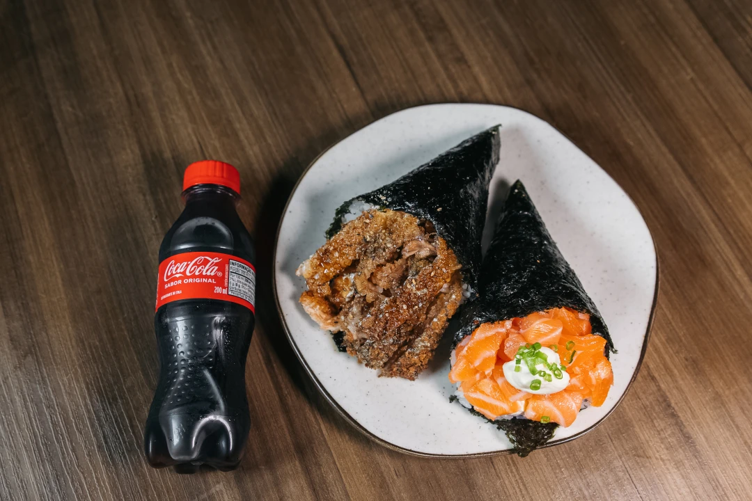 Pedindo esse combo, chegará em breve na sua casa um delicioso Temaki Philadelphia, recheado cream cheese e salmão fresco, um Temaki Skin com pele de salmão crocante. Acompanhados de uma refrescante Coca-Cola de 200ml bem gelada.