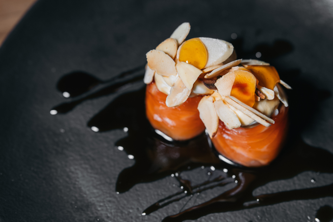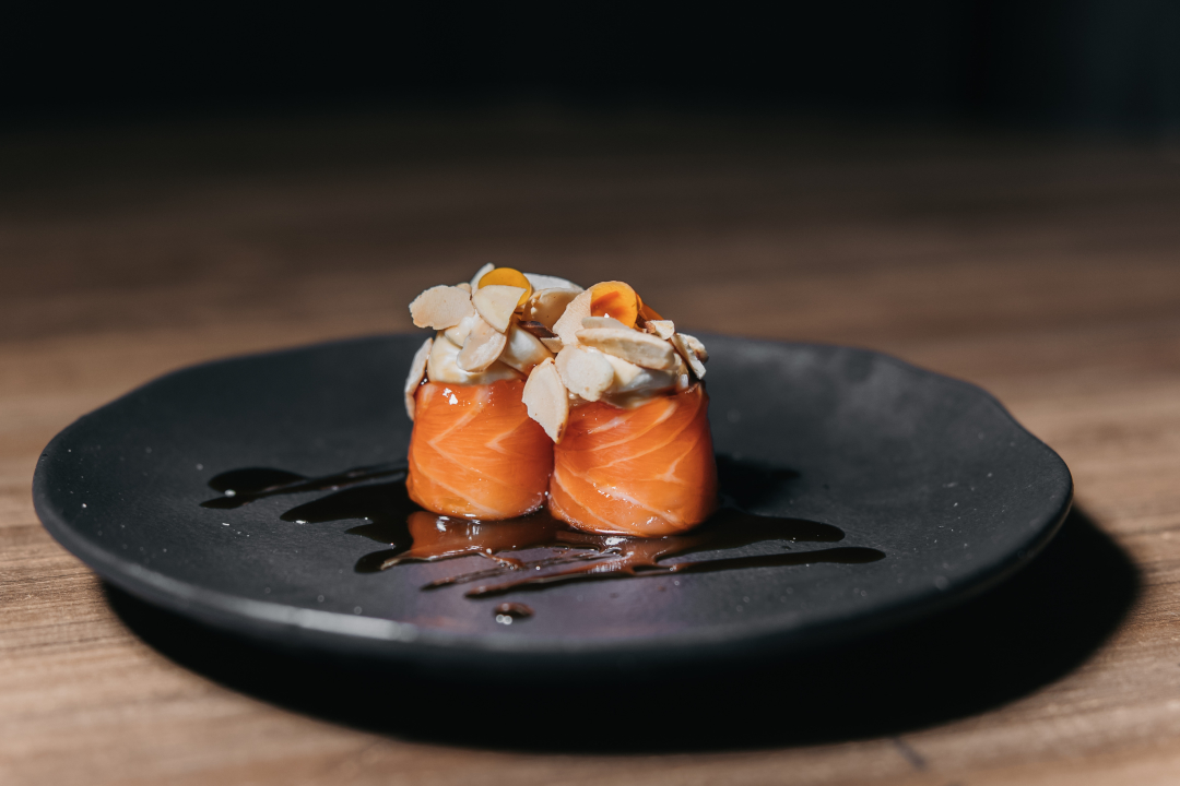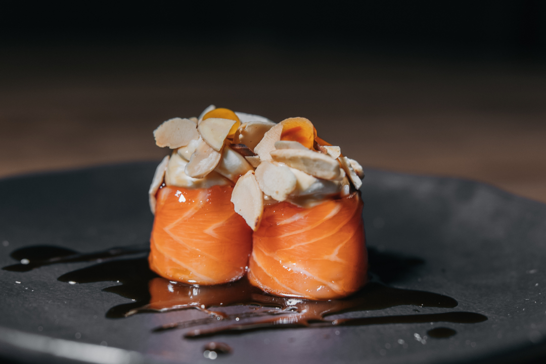 Cada peça é habilmente envolvida por uma lâmina de salmão fresco e coberta com uma generosa porção de cream cheese. O toque final vem com a nossa geléia de pimenta e o molho tarê.